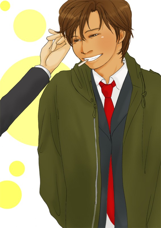 青島コートに咥え煙草に、笑顔。