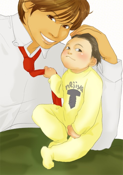 赤ちゃんとオールバックにして誰かさんのようだと嬉しそうな青島君と、