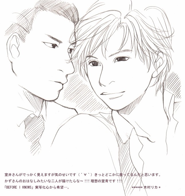 木村リカ様 リカさんから強奪、第三弾です!我侭を言って、拙宅に飾らせて頂きましたv 満を持して室井さんの登場!(笑) 室青ですよ、室青!見詰め合っちゃてますよ!(うるさい) 男前な室井さんと、めんこい青島君。ラブですvvv リカさん、ありがとうございました!
