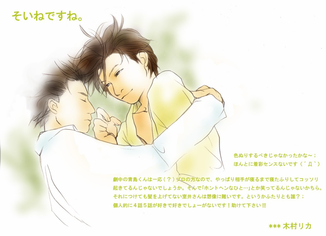 木村リカ様 どどどどうしましょう!リカさんが、 「An encounter(fortune)」の三話目で添い寝している(であろう)二人の姿を書いてくださいました!! 室井さんの穏やかな寝顔はもちろん、青島君の優しい微笑がぁ〜堪らない〜v 元が自分の小説だなんて信じられない〜〜〜(><) 本当に感動しました。 リカさん、ありがとうございました!!